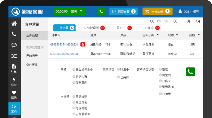 客服在线下单后,订单自动对接至超级售后系统,分派网点,师傅预约服务,客服在线跟踪
