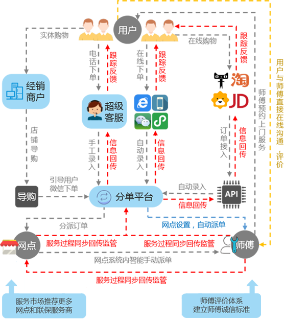 与电商平台互联,消费者购买电器后,直接对接订单,实现师傅主动预约